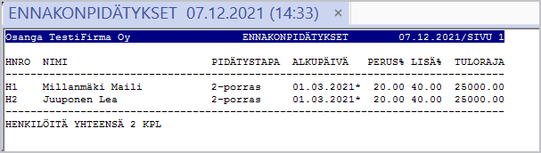Tällä toiminnolla voit noutaa ennakonpidätystiedot yrityksen palkansaajille. Henkilörajauksella voit rajata henkilöt joille verokorttitietoja noudetaan. Voit noutaa raportin tai tallentaa tiedot henkilökortille. Ohjelma käyttää kuluvaa päivää hakuun; tätä uudempia verokorttitietoja ei noudeta. Nouto tapahtuu verottajan VeroAPI:sta. Käytössä on sama varmenne kuin tulorekisterissä ja ApitamoPKI:ssä.