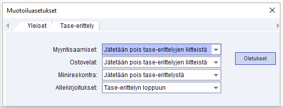 | Myyntisaamiset | Haetaanko myyntisaamiset automaattisesti tase-erittelyn liitteeksi. |