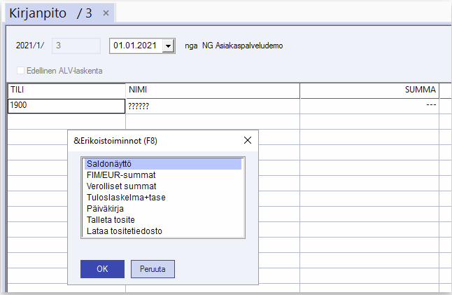 | Saldonäyttö | Näyttää tositteella tilien saldot vientien jälkeen. Toiminto oli aiemmin Ent.Saldo, Ent.Tosite, Nyk.Tosite ja Nyk.Saldo. |