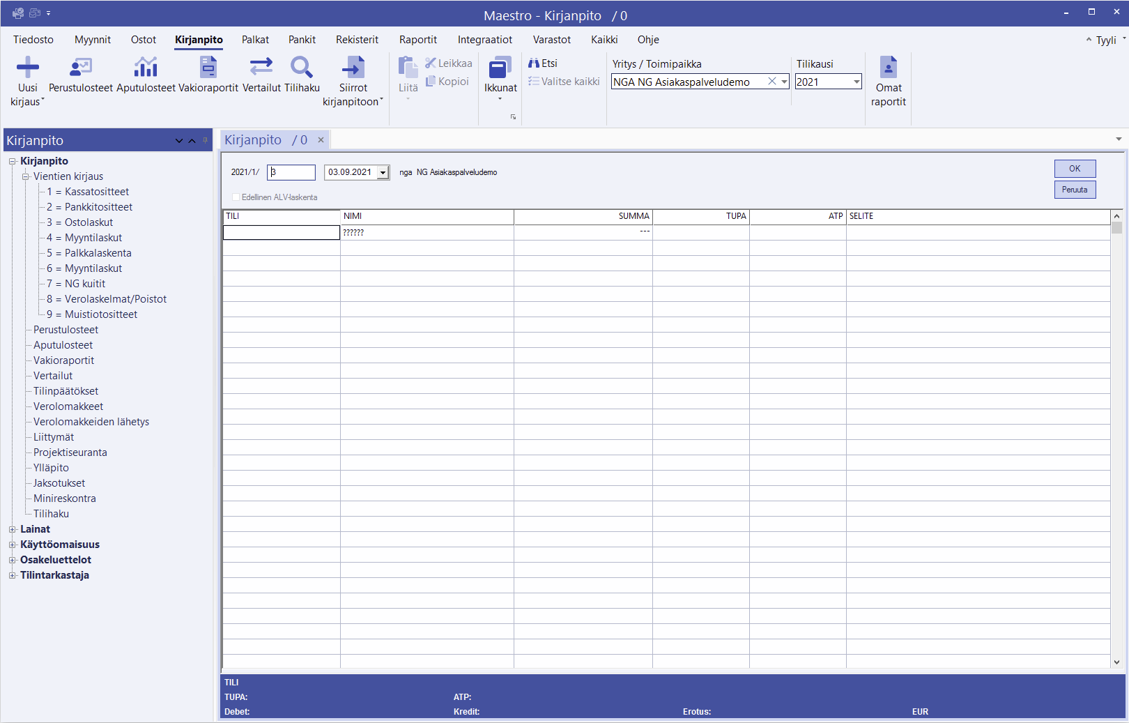 | Summa | Tähän kirjaat viennin summan. Rahan käyttö (Debet) kirjataan positiivisena ilman etumerkkiä, ja rahan lähde (Kredit) negatiivisena miinus-etumerkillä. Kredit-vientiä ilmaiseva miinus-merkki voidaan syöttää myös summan perään, koska Maestro siirtää sen automaattisesti summan alkuun. |