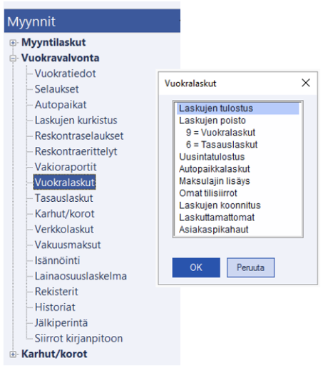 Valitse Myynnit/Vuokravalvonta/Vuokralaskut.