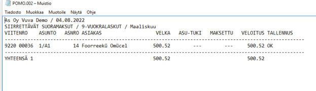 Esimerkiksi kun tulostustavaksi on valittu Koontilasku, valittujen asuntojen laskut muodostetaan reskontraan ja samalla tulostetaan asunnoille koontilaskut paperille. Jos asiakkaalla on suoramaksu käytössä, koontilaskulle tulostuu teksti: