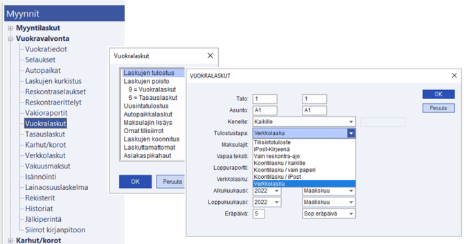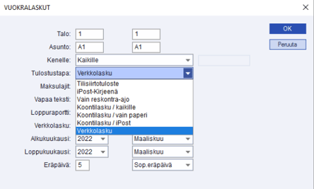 Valinnalla Vuokralaskut/Laskujen tulostus voi valita tulostustavaksi myös Verkkolaskun. Tätä valintaa kannattaa käyttää, kun halutaan tulostaa lasku esimerkiksi yhdelle asiakkaalle ja/tai yhdelle kuukaudelle. Näin saadaan suoraan sähköinen lasku asiakkaalle, joilla on laskutustapana suoramaksu tai kuluttajan E-lasku. Valinta rajaa mukaan asiakkaat, joiden asiakastiedoissa on Tulostustapa-valinta Normaali tai Sähköinen lasku.