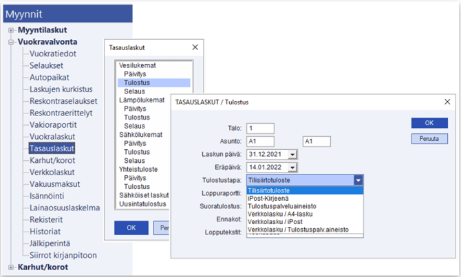 Tasauslaskujen osalta voidaan valita, halutaanko tulostaa suoraan verkkolaskut vai esimerkiksi tilisiirrot paperille.