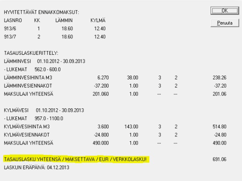 Jos tulostustavaksi valitaan Verkkolasku, tulostetaan kaikille tilisiirrot paperille, ja muodostetaan sähköiset laskut niille asiakkaille joilla on käytössä suoramaksu- ja E-lasku. Tasauslasku yhteensä –rivillä näkyy VERKKOLASKU!, jos asiakkaalla on käytössä suoramaksu tai E-lasku.
