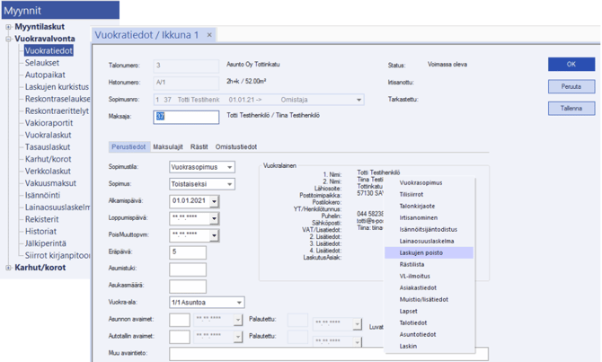- Valitse tarvittaessa Vuokra, Autopaikka, Käyttökorvaus tai Muu