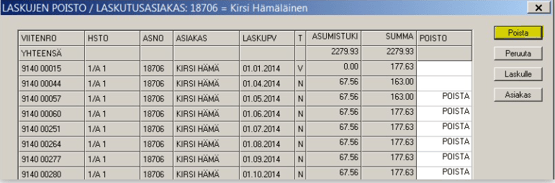 Jos asiakkaalle on lähetetty virheellinen lasku, voidaan se poistaa reskontrasta esim. vuokratietojen kautta Vuokranvalvonta/Vuokratiedot valitse talo, hstonumero, oikea sopimus ja tämän jalkeen maksaja= asiakas. Kun asiakkaan sopimus on avattu, hiiren oikealla painikkeen valikosta valitaan Laskujen poisto. Ruudulle tulee laskut, jotka voi poistaa.