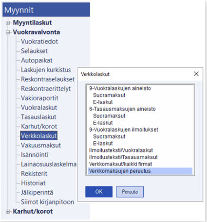 Kun laskun poisto tehdään näin, lasku poistuu samalla myös reskontrasta. Jos asiakas on maksanut vuokran etukäteen ja hänelle on lähetetty turhaan pankkiin E-lasku tai suoramaksu, voidaan pankkiin lähettää laskun peruutussanoma. Näin tehtynä lasku ei poistu reskontrasta, ainoastaan pankkiin lähetetty turha lasku saadaan poistettua. Valitse Verkkolaskut/Verkkolaskujen peruutus.