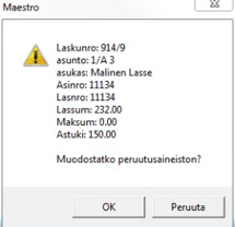 Jos peruutusaineistoa ei muodosteta, valitse Peruuta. Jos peruutusaineisto halutaan muodostaa, valitse OK. Onnistuneen verkkolaskutiedoston muodostamisen jälkeen saadaan ilmoitus "Verkkomaksun aineisto on muodostettu onnistuneesti". Peruutuslasku on vielä lähetettävä pankkiin Verkkolaskujen lähetys –toiminnolla.