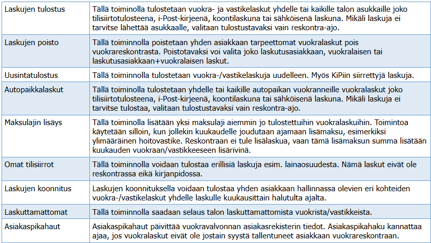 Vuokra- ja vastikelaskujen tulostus, laskujen poisto ja pankkiin lähetetyn laskusanoman peruutus