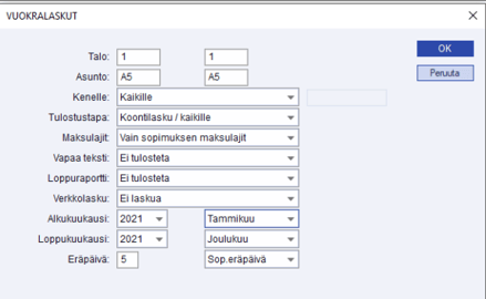 - Alkukuukausi-, Loppukuukausi- ja Eräpäivä-valinnoilla voi valita, mille ajalle laskut tulostetaan.