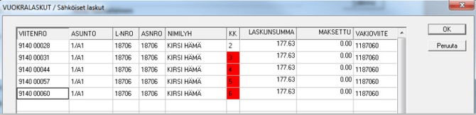Verkkolaskut/Verkkomaksut/9 - Vuokralaskujen aineisto/Suoramaksut tai E-laskut. - Verkkolasku - Tällä valinnalla voidaan tulostaa sähköiset laskut suoramaksu- tai e-lasku –asiakkaille. Rajaa mukaan asiakkaat, joiden asiakastiedoissa Tulostustapa –valinta on Normaali tai Sähköinen lasku. Tiedot päivittyvät ensin reskontraan, jonka jälkeen ruudulle tulostuu kyseiset laskut. Kun tämä hyväksytään painamalla OK, laskuista muodostetaan sähköiset laskutiedostot.