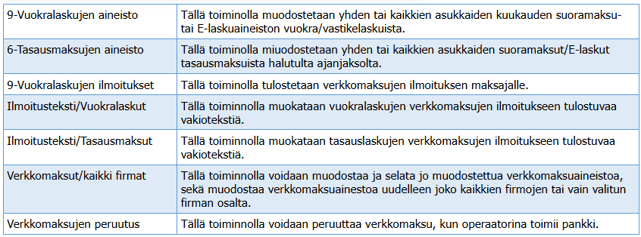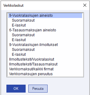 Kun vuokra- tai vastikelaskut on muodostettu reskontraan esimerkiksi vuodeksi eteenpäin, täytyy E-laskujen tai suoramaksujen verkkolaskutiedostot muodostaa kuukausittain valitsemalla joko Verkkolaskut/Verkkomaksut /kaikki firmat tai Verkkolaskut/9 - Vuokralaskujen aineisto/Suoramaksut tai E-laskut. Verkkolaskut muodostetaan niille asiakkaille, joille ei ole ko. kuukautena muodostettu verkkolaskua. Myös tasauslaskujen suoramaksu- tai E-laskuaineisto voidaan muodostaa tällä toiminnolla, kun tasauslaskut on muodostettu tasausmaksureskontraan.