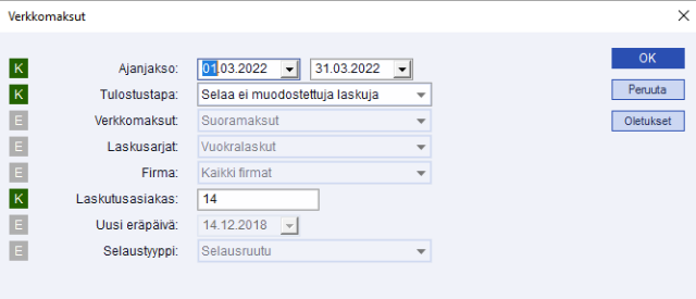 - Vain reskontra-ajo - Tämä valinta muodostaa laskut reskontraan. Reskontra-ajon jälkeen laskut voidaan tulostaa sähköisiksi kuukausittain toiminnolla Verkkolaskut/Verkkomaksut/kaikki firmat, tai