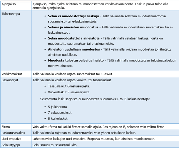 - Tulostusraportti-valinnalla valitaan tulostuuko lista laskuista raporttina näytölle.